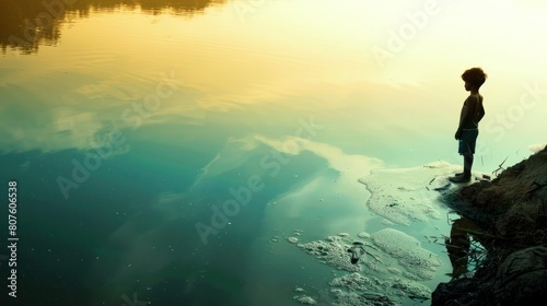 child's silhouette standing on the edge of a polluted river, looking out at the vast expanse of contaminated water, signifying the overwhelming impact of pollution.