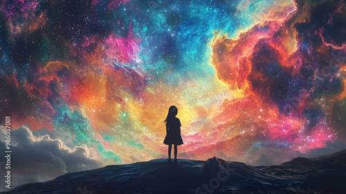 childs silhouette stands against vibrant cosmic backdrop filled with swirling colors and stars, evoking sense of wonder and imagination