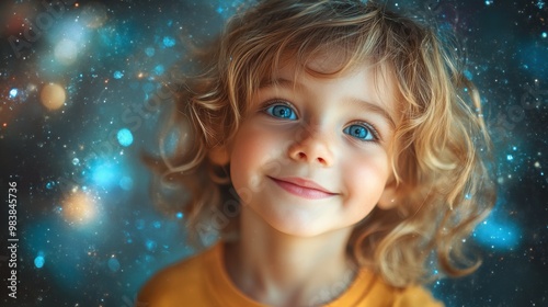 Child's Wonder: A closeup portrait of a young girl with captivating blue eyes and a heartwarming smile, bathed in a magical backdrop of twinkling lights, evoking a sense of innocence and pure joy.