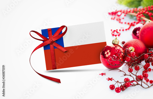 Chile flag on new year invitation card with red christmas ornaments concept. National happy new year composition.