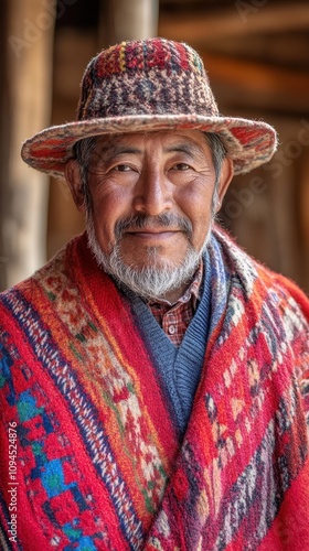 Chilean man in vibrant traditional attire stands proudly in a rustic village backdrop