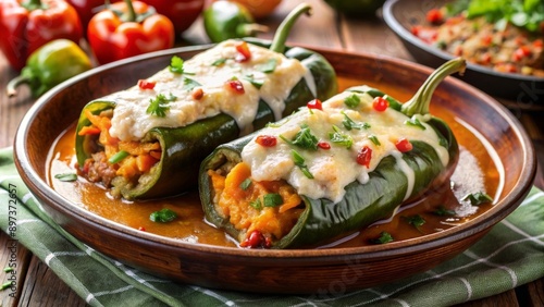 Chiles rellenos servidos en un plato de cerámica, decorados con queso derretido y cilantro.