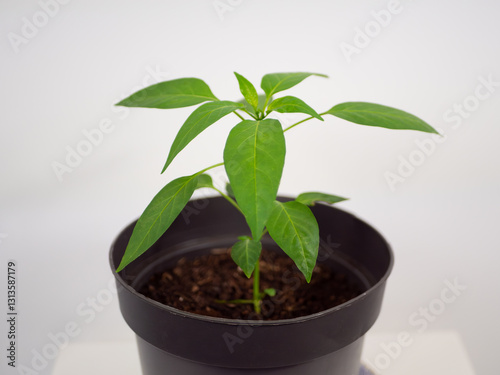 Chili pepper plant, growing in a black plant pot at home.