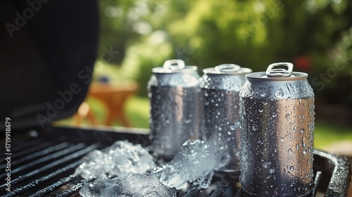 Chilled cans of beverage sit on ice, glistening with condensation, ready for a warm day outdoors, emphasizing relaxation and enjoyment.