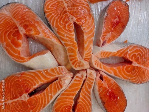 chilled light orange red fish steaks on the counter of a fish shop
