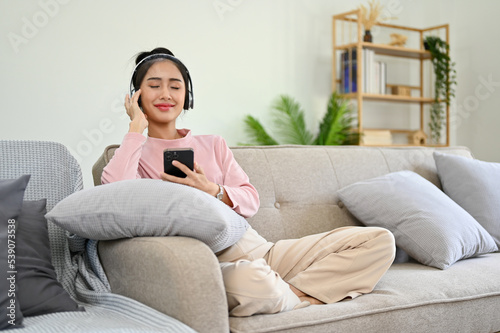 Chilling and relaxing Asian female on sofa, listening to music through her headphones.