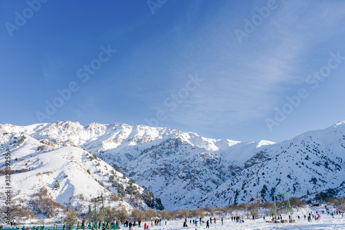 Chimgan ski resort in winter on a Sunny clear day. Chimgan mountain in Uzbekistan