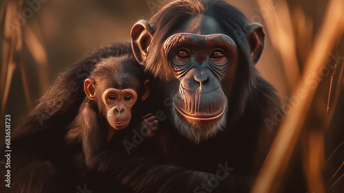 Chimpanzee Mother Petting Her Son in a Tender Way Blurry Background