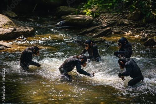 Chimpanzees playing near stream in vibrant forest setting captured vividly