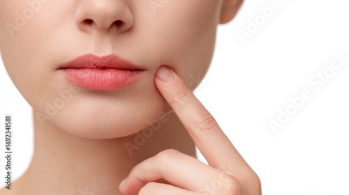 Chin Acne. Woman Pointing to Red Pimple on Chin - Acne Problem on Female Face