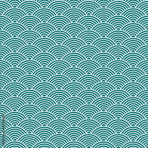Chinese and Japanese seamless pattern. Traditional asian ornament, oriental New Year decoration. Modern green background, geometric texture with waves. Vector illustration