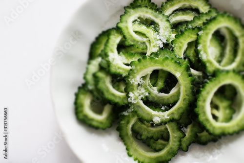 Chinese cooking, salted bitter melon on dish with copy space