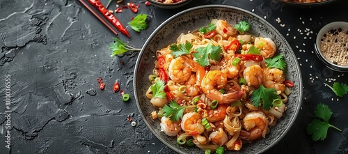 Chinese food on a dark background with copy space, top view. Asian cuisine concept. Spicy pad Thai and shrimp or chicken noodles in a bowl for a smart phone wallpaper, poster design, banner