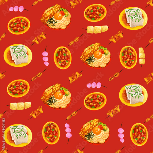 Chinese food seamless pattern. Hand drawn different types of asian food in wooden steamers repeating background. Tasty chinese food, delicious har gao, sticky rice, rolls.
