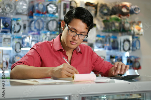 Chinese Man Working In Computer Shop Checking Bills And Taxes