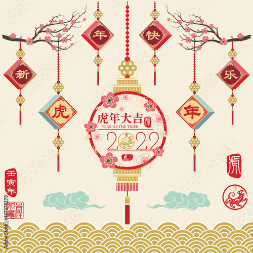 Chinese New Year 2022 Vector Design. Chinese Calligraphy translation Tiger Year and "Tiger year with big prosperity". Red Stamp with Vintage Tiger Calligraphy.