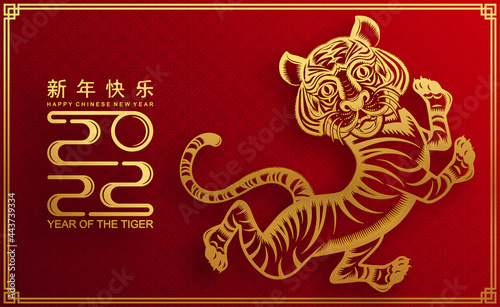Chinese new year 2022 year of the tiger red and gold flower and asian elements paper cut with craft style on background.( translation : chinese new year 2022, year of tiger )