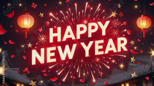 Chinese New Year Celebration with Fireworks and Lanterns. Festive Red Scene Wishing "HAPPY NEW YEAR".