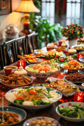 Chinese New Year festival, serene family dinner setting, traditional dishes on the table, warm lighting, harmonious atmosphere
