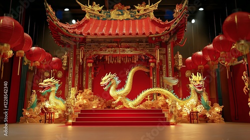 Chinese new year stage decorations with golden dragons and red lanterns creating a festive ambiance