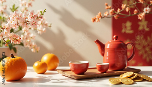 Chinese New Year Table with Oranges, Gold Coins, Tea Set, and Flowers