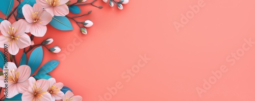 Chinese New Year theme background. Soft pink flowers with green leaves on a coral background create a vibrant and fresh floral design.