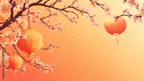 Chinese New Years, A tree with pink blossoms and lanterns hanging from it