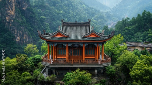 Chinese pavilion set on a mountain ridge, showcasing the delicate carvings, bright colors, and harmony with the breathtaking natural surroundings.