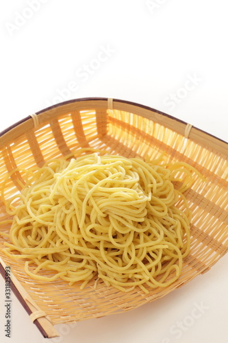Chinese ramen noodles in basket with copy space
