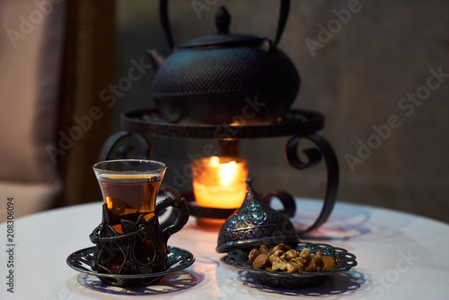 Chinese tea ceremony. Black Ceramic tea pot and cups with the famous chinese puerh tea with vapour on a gray background.