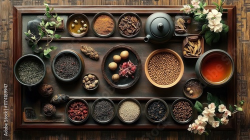 Chinese Tea Ceremony Traditional Setup Aerial View with Spices Leaves and Natural Lighting