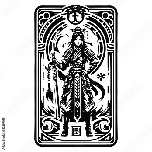 chinese warior female with tarot card in black and white illustrations, cutout graphic