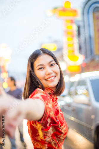 Chinese women travel with chinese new year costume leading man hand to travel in Yaowarat
