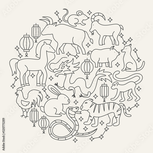 Chinese Zodiac Line Icons Circle. Vector Illustration of Outline Design.