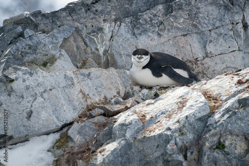 Chinstrap penguin lies on rock facing camera