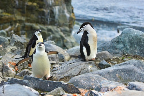 Chinstrap Penguins Standing on Rocky Antarctic Cliff Above Antarctic Shoreline
