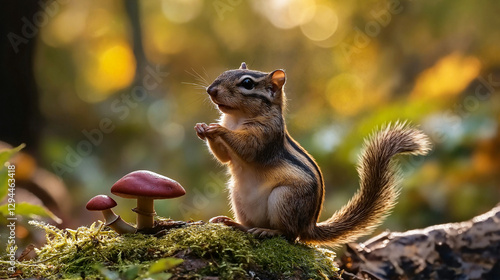 Chipmunk and mushrooms on mossy log.
