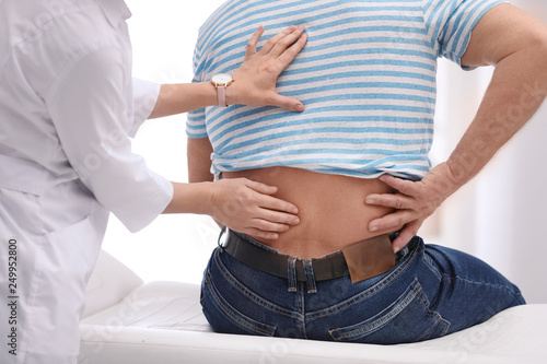 Chiropractor examining patient with back pain in clinic, closeup