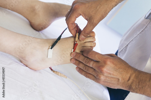 Chiropractor performing a foot electrotherapy