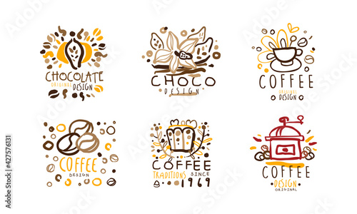 Chocolate and Coffee Traditions Logo Original Design Templates Set, Retro Hand Drawn Labels Vector Illustration