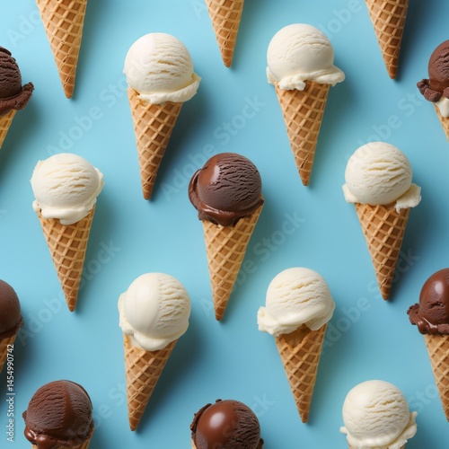 Chocolate and vanilla ice cream cones arranged in seamless pattern. Summer treat theme