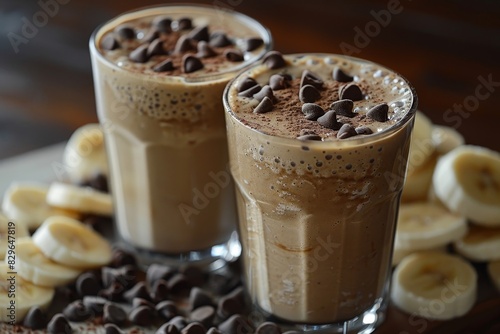 Chocolate Banana Smoothie - Light brown with a dusting of cocoa powder and banana slices.
