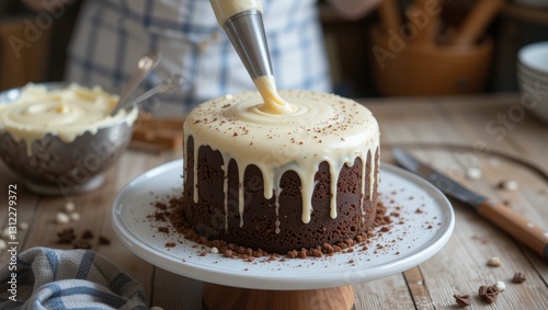 Chocolate Cake Being Decorated with Cream Frosting and Sprinkles in a Cozy Kitchen Setting
