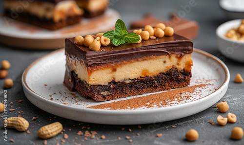 Chocolate cake with caramel, hazelnuts and meringue. Chocolate cake with butter cream and chocolate drops. Cake with meringue. Sweets.