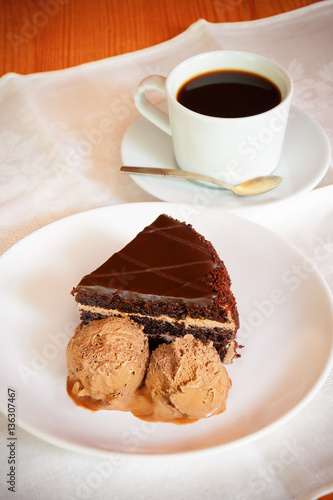 Chocolate cake with ice cream and cup of coffee. Selective focus on cake