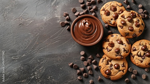 Chocolate chip cookies with a bowl of chocolate dipping sauce and scattered chocolate chips on a dark background.