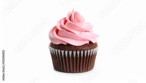 Chocolate cupcake with pink frosting swirl isolated on white background
