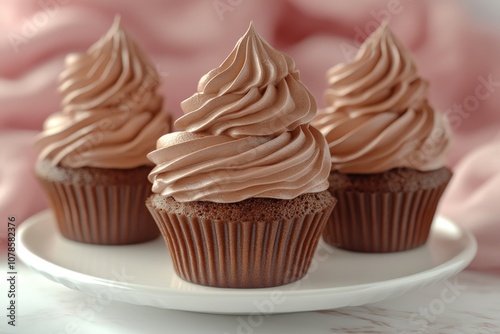 Chocolate cupcakes topped with swirls of mocha frosting set against a soft pink background showcasing sweet indulgence and bakery artistry