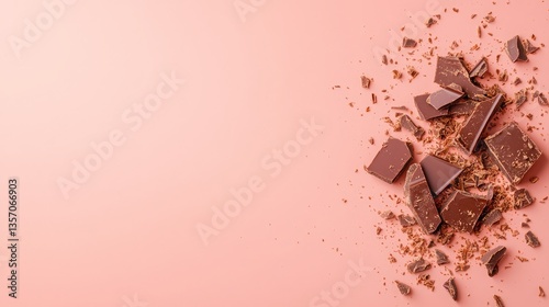 Chocolate dark fusion. A pile of broken dark chocolate pieces scattered on a soft pink background, showcasing texture and contrast.