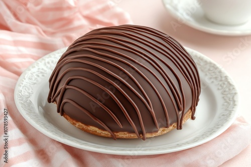 Chocolate dome dessert with drizzled dark chocolate glaze elegantly placed on a white plate with soft pink fabric creating a luxurious and decadent ambiance